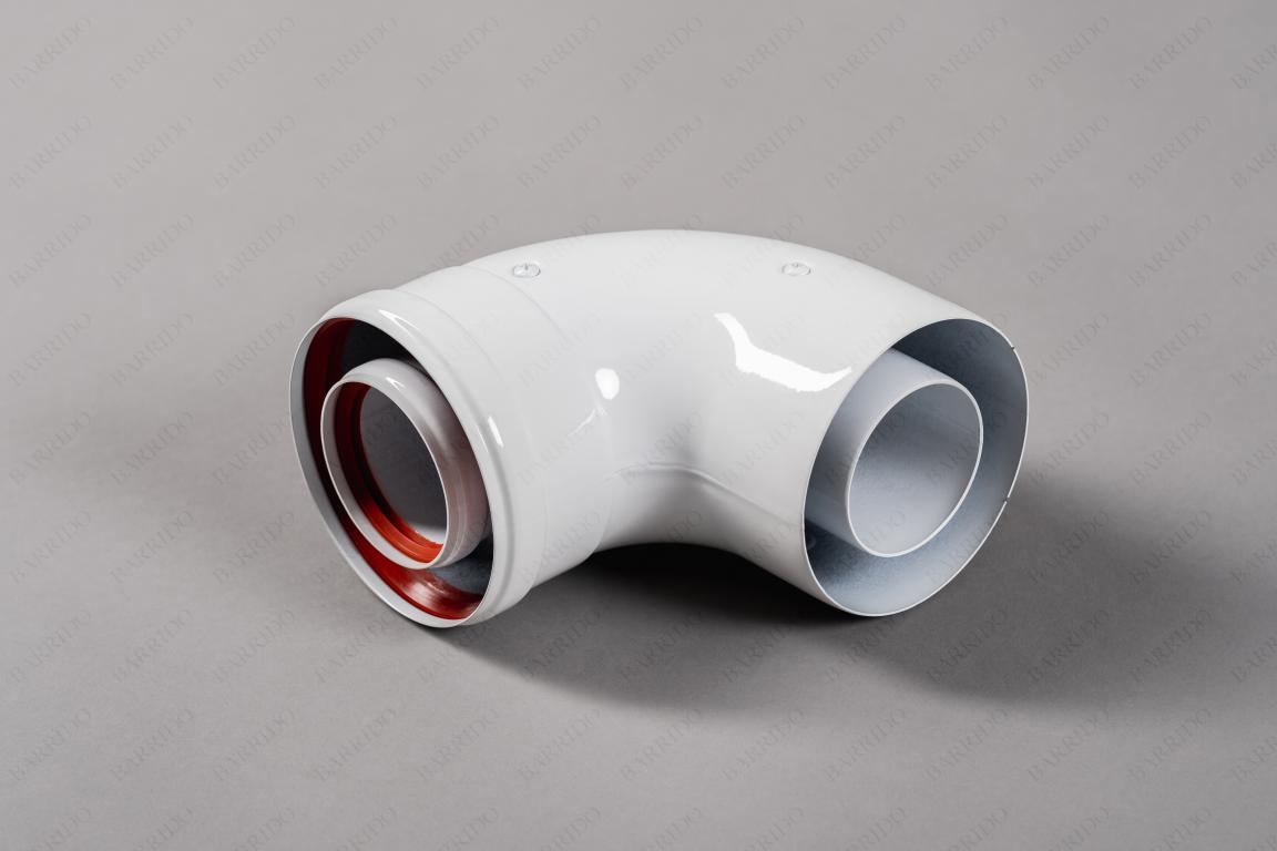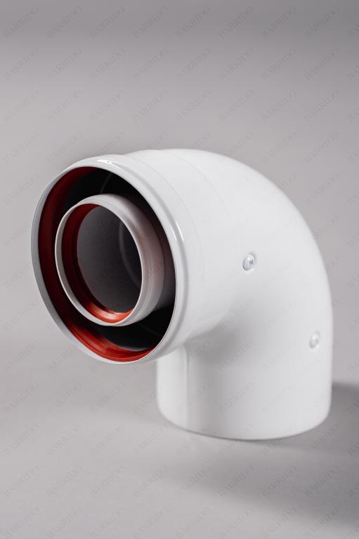 Промежуточный коаксиальный отвод 90° без муфты, диам. 60/100 мм. Промежуточный коаксиальный отвод 90° из высококачественного алюминия эмалированный. Используется для промежуточных участков (второй и последующий повороты). Не подходит в качестве начального участка. Поставляется в индивидуальной картонной коробке, в комплекте имеются силиконовые уплотнители.